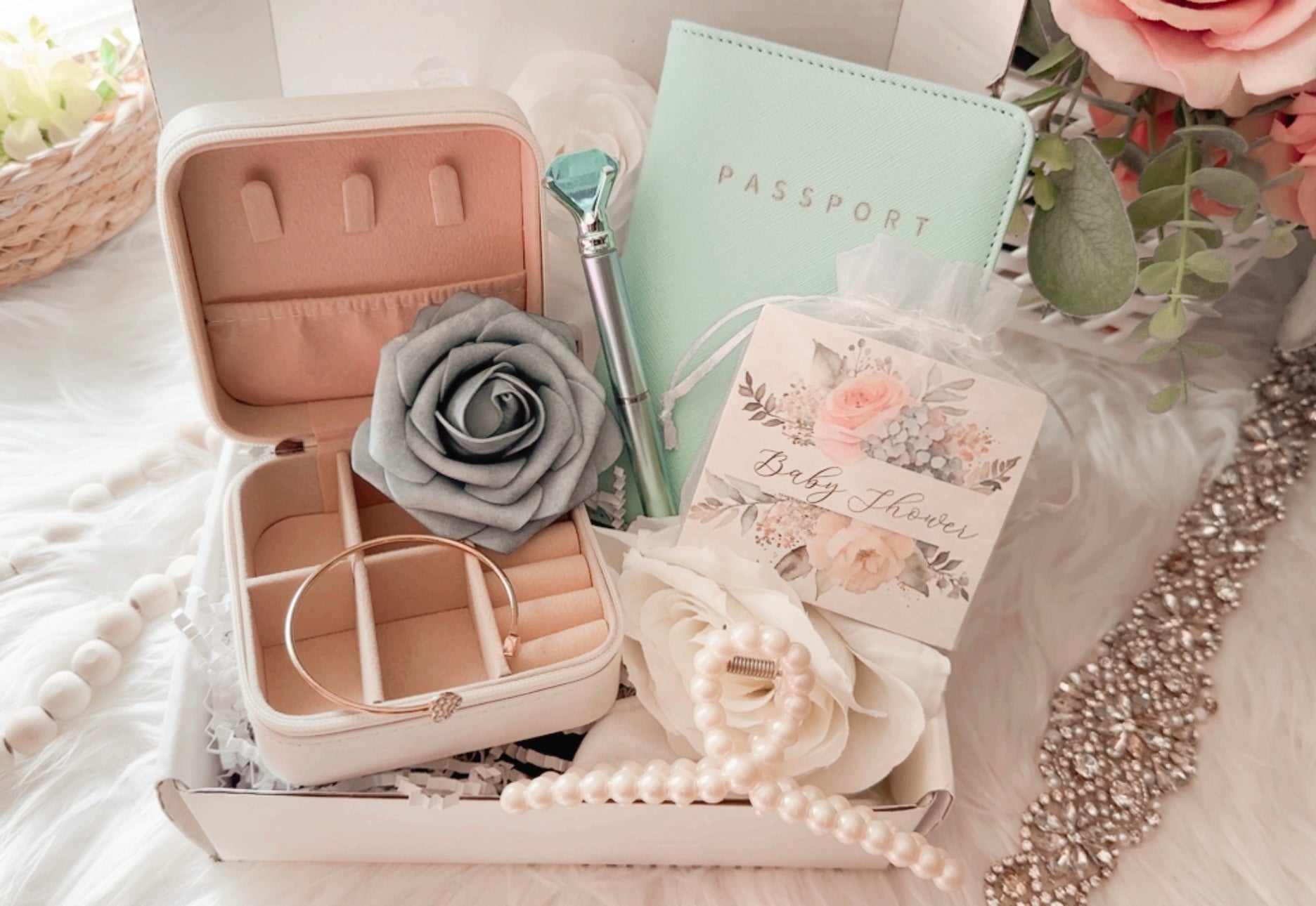Comes beautifully packaged in a box with a blue faux flower and crinkle paper. Inside, you'll find a blue custom passport cover with a heart at the end of the name, a custom white travel jewelry box with a ribbon tie, diamond pen, gold bracelet, white heart keychain and a pearl hair clip.