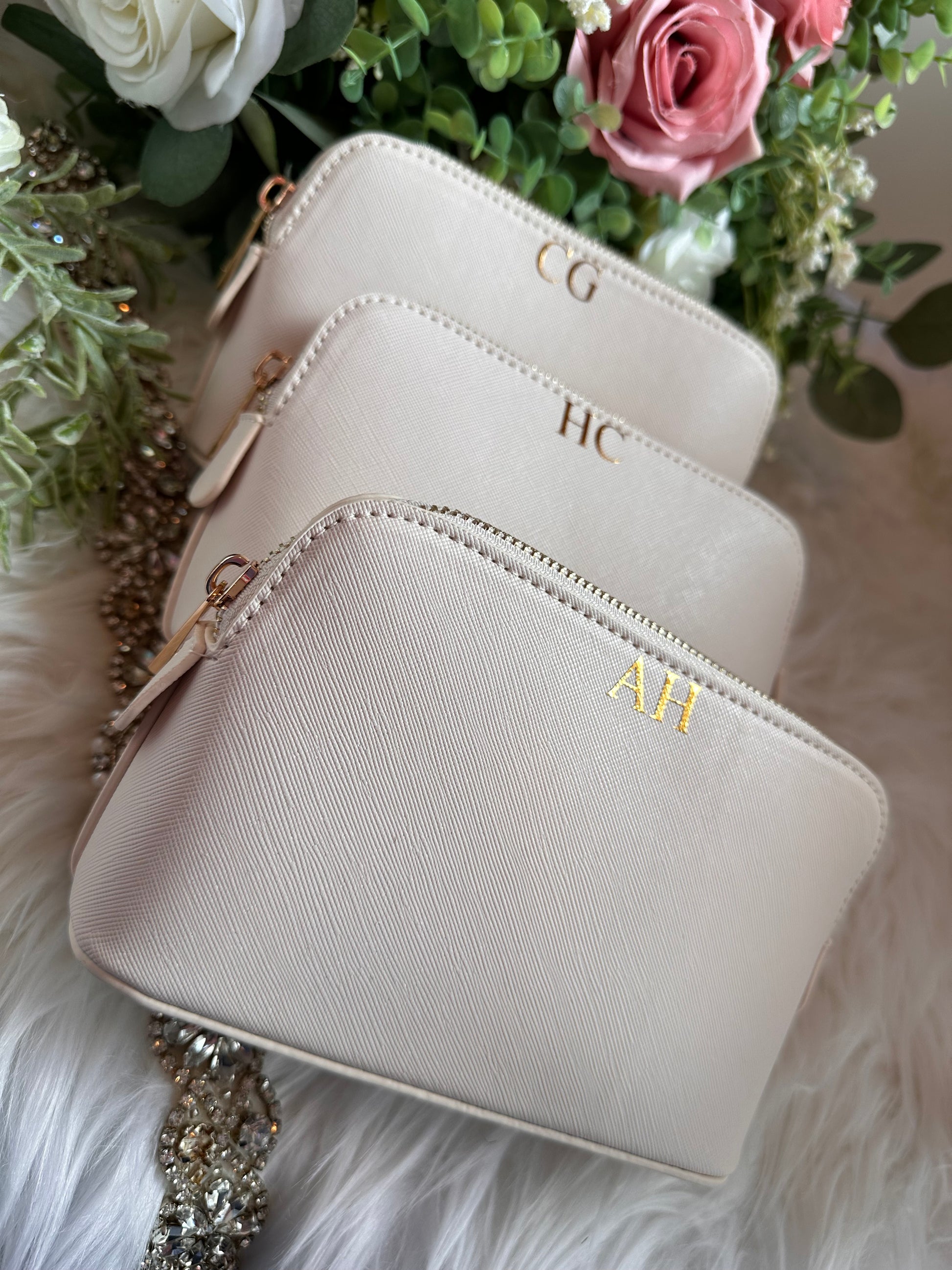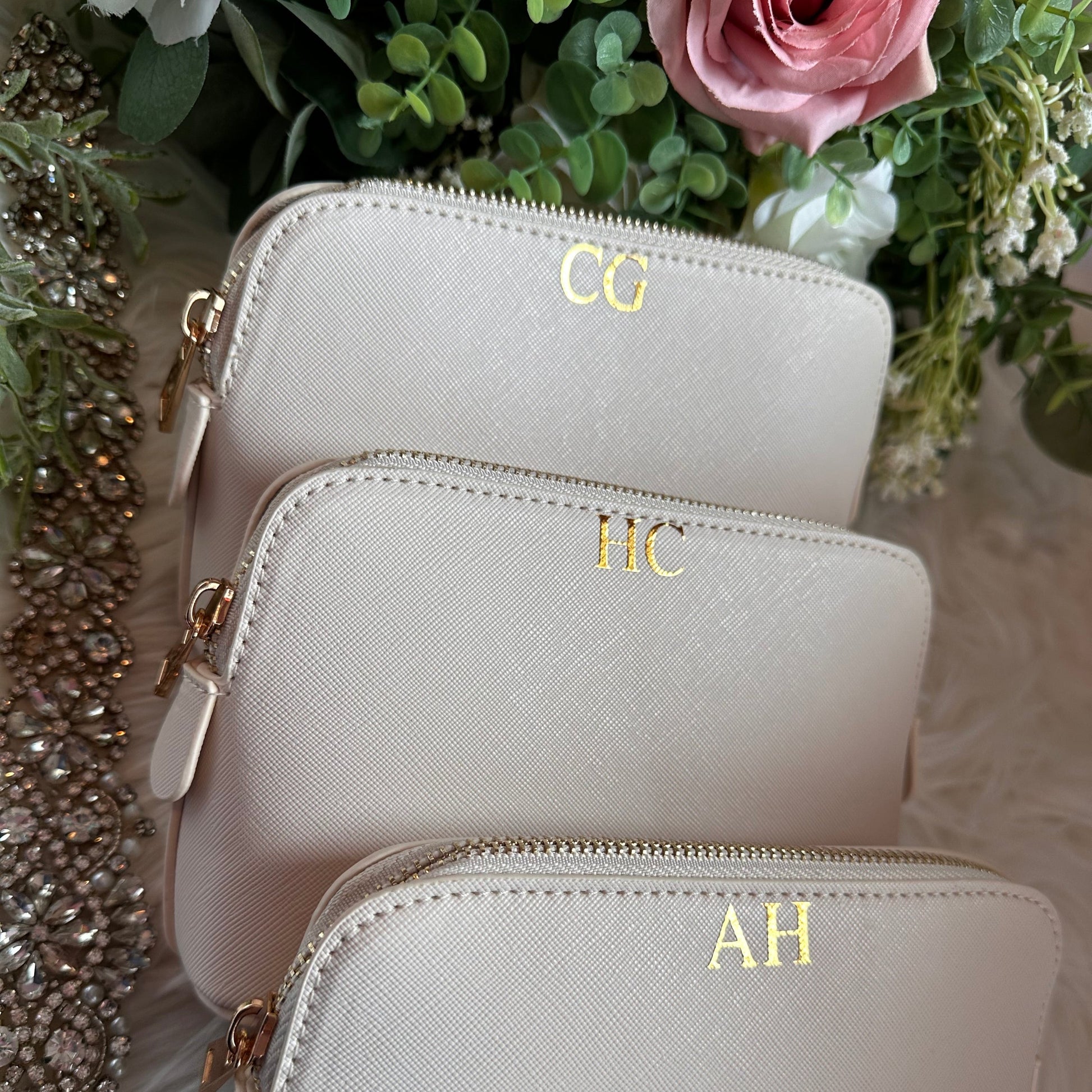 This customizable cosmetic bag offers three color choices pink, tan, or black paired with your choice of elegant gold or bold black font. Designed to keep your makeup and accessories neatly organized, it combines style and functionality for those always on the move. Stay effortlessly chic and organized wherever you go.