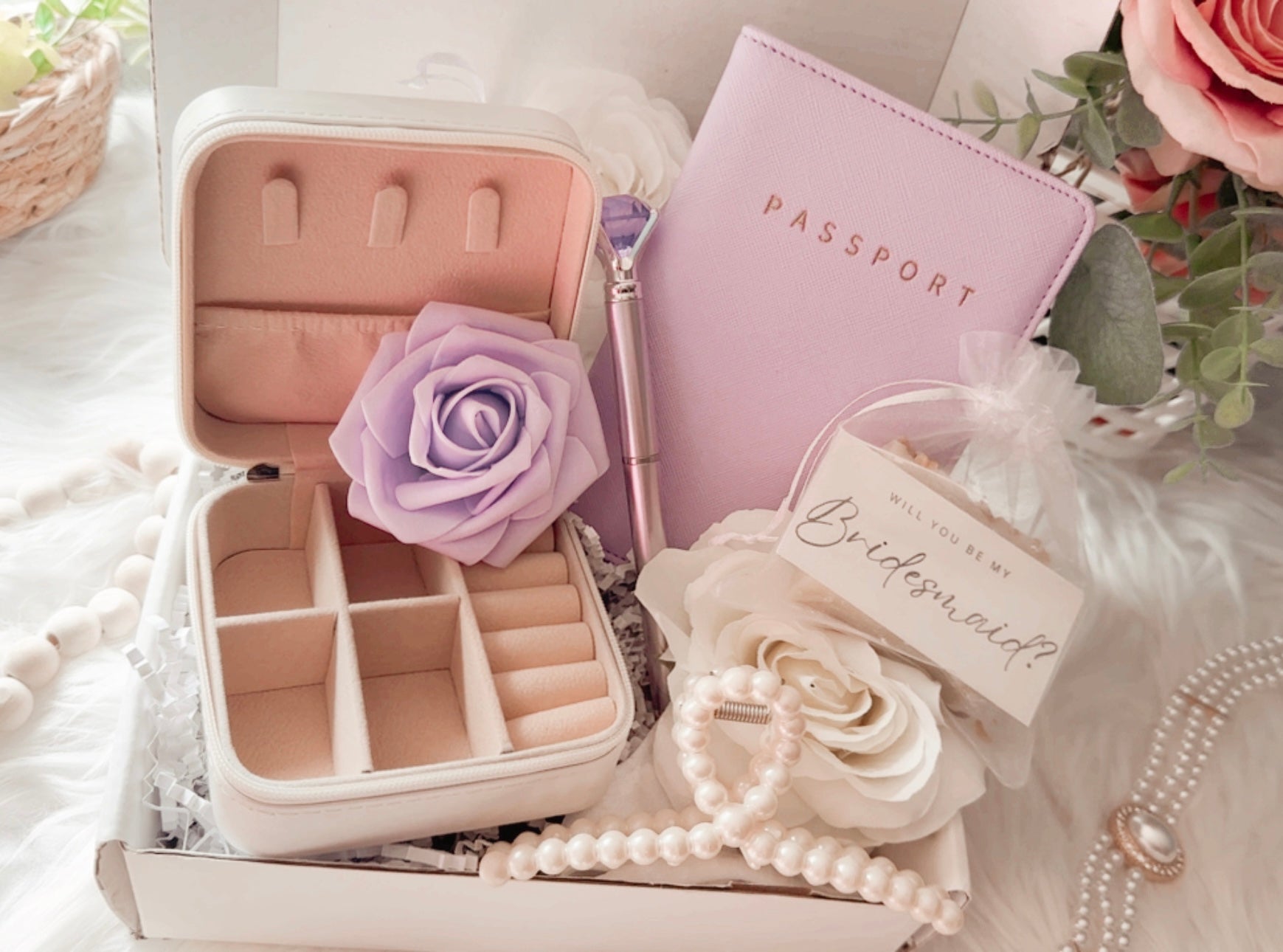Comes beautifully packaged in a box with a purple faux flower and crinkle paper. Inside, you'll find a purple passport cover with a heart at the end of the name, a custom white travel jewelry box with a ribbon tie, diamond pen, "will you be my bridesmaid" card with 2oz natural Sharana Soap. and a pearl hair clip,