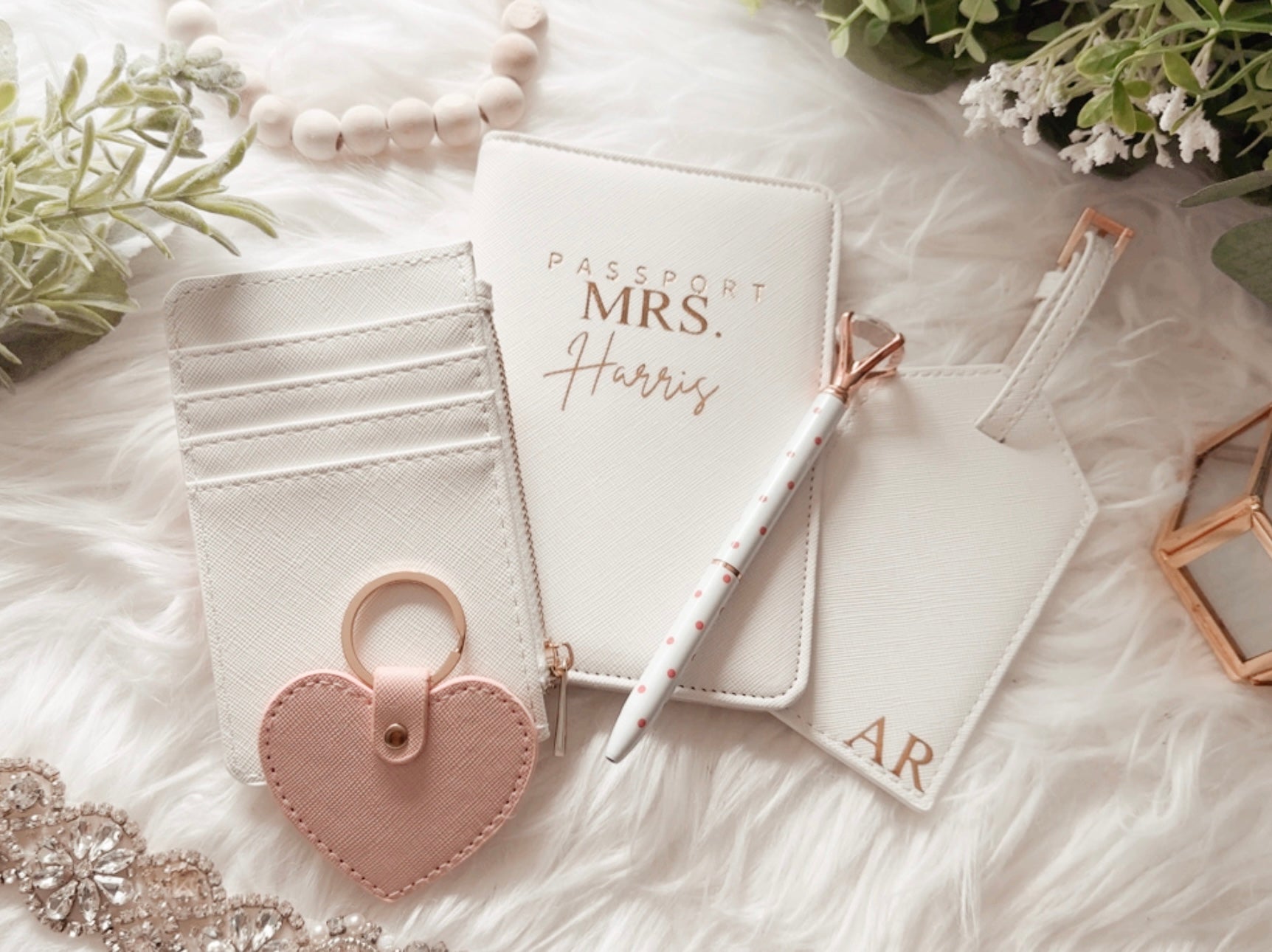 Comes beautifully packaged in a box with a white faux flower and crinkle paper. Inside, you'll find a white passport cover, luggage tag, zip card wallet ( non custom ) diamond pen and a pink heart keychain.